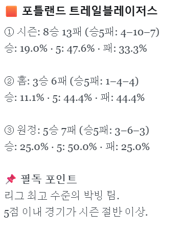 오늘 후원자님 전용 컨텐츠의 내용 하나만 공유해드리자면, 포틀랜드는 5점이내의 박빙 경기가 절반 가까이 되고, 원정은 50% 입니다.